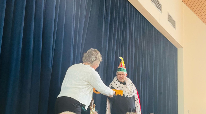 Het carnavalsfeest begon al tijdens de dagopening. Onze directeur/bestuurder, Marieke Weersink, droeg de sleutel over aan prins carnaval Lieuwe, die dan de baas is van OlmenEs. Samen met zijn hofnar Stefan deelde hij heerlijke gebakjes uit aan iedereen in de werkplaatsen.