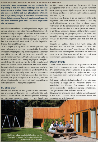 In het nieuwste nummer van Beleef Ooststellingwerf staat een interview met begeleiders en verwanten van woonhuis de Platanus. Journalist Anita Boel sprak met Ryanne Boersma, Sipke Sikkes, Erna van Elk, Pim Hauer en Marissa Wolthers over betrokkenheid, zorg en samen leven op OlmenEs.